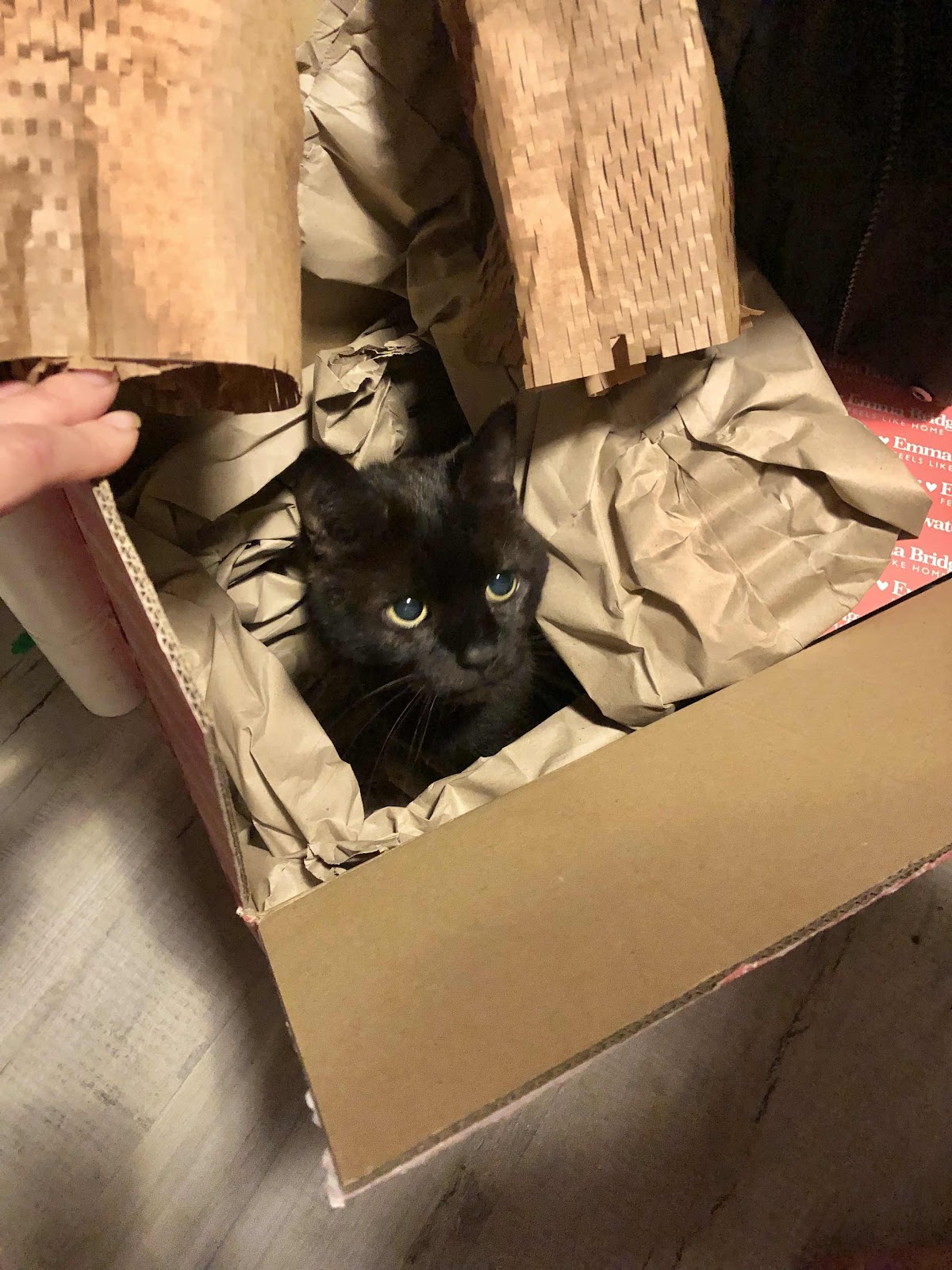 She snuggles in the packaging , admiring the nice rusty paper padding.